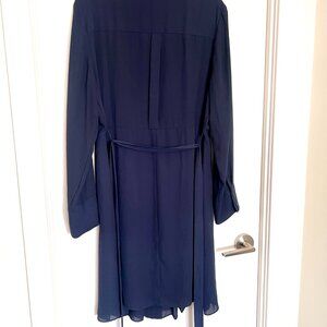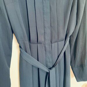 Size 16 - this sheer, navy dress features pleated front and darted center back with a belted waistline.