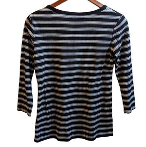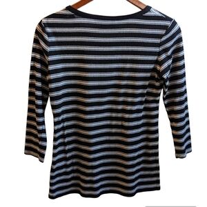Nanette Lepore long sleeved shirt in black and white horizontal stripes. size medium. 100% rayon. in like new condition. light weight material. good for spring and fall.