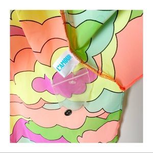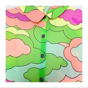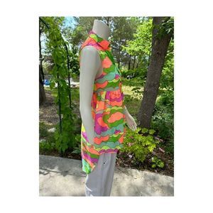 Measures 17” chest, length 26” front and 36” back. Neon cloud print, large keyhole open upper back. High low length. 1/2 button down front. Tunic style shirt blouse. Sleeveless. Has collar. 100% sheer polyester. No stretch. Has extra button attached to fabric tag in mini ziploc. No rips, tears or stains. No runs. Pet and smoke free home.