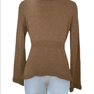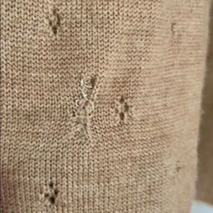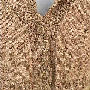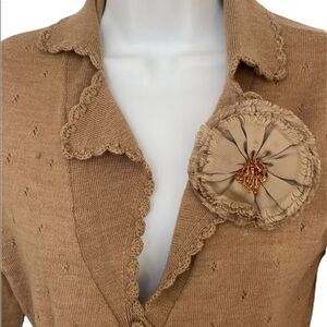 Annette Lepore ,Camel coloured knit cardigan, front buttons with a ribbon that ties around the waist. The knit has little crocheted eyelets throughout. The lapel flower is removable and the sleeve cuffs are crocheted and a little wider, all this detail gives it a boho look. In good pre-owned condition except for one small repair on right sleeve as shown in pic