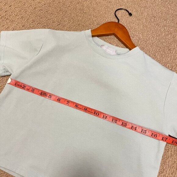 This minimalist sage green cropped tee by Naning9 is a versatile staple with a clean silhouette and soft feel. Made in Korea with a comfortable and stretchy cotton blend, it's perfect for casual everyday looks or layering under jackets and cardigans.