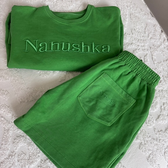 • In great overall condition! ⚠️ Please note: small stain on the back of shorts, as shown in photos. Additionally, the set has no inner brand tags - the only branding is the Nanushka embroidery along the front of the sweatshirt and on the back pocket of the shorts