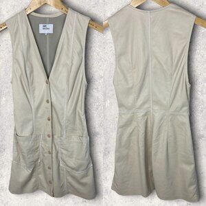 Nanushka Menphi Vegan Leather Dress in Beige / Cream and Women's Size XS. Retails for $495.00 USD (approximately $688 CAD). Has a sleeveless design and a relaxed shape so you can move to your heart's desire without any restrictions. Dress up so that you can get down on the dance floor. Featuring a v-neck, a front button fastening, stitching details, front pockets, a sleeveless design, a short length and a straight hem. 100% artificial leather (polyester and polyurethane). Lined. Buttons made from wood. Front pockets. Dry clean. Very good pre-loved condition but note a few faint marks on the front - see photos.