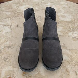The Naot Emerald is a fun and cute every day ankle boot with a geometric cut out design. Featuring a combination of leather and suede with side zippers. Orthotic friendly. These comfortable boots are in excellent preowned condition.