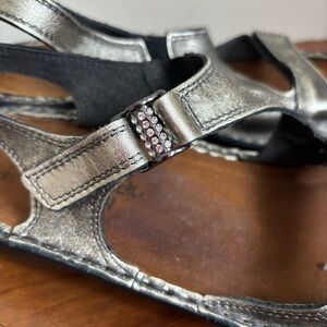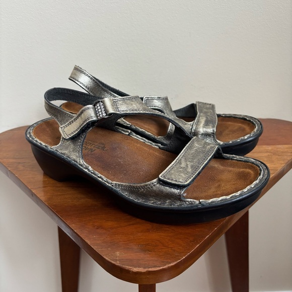 The Naot Faso is a great everyday sandal with a backstrap for extra stability & support. This sandal has a hook & loop closure at the instep for adjustability. Naot's removable and replaceable anatomic cork & latex footbed is wrapped in pampering suede and molds to the foot with wear. Size 38 (size 7)Fits true to size but size up for half sizes. Worn a few times and still in excellent condition. One gem missing from the left sandal.