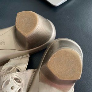 These dress sandals are like new. They have only been worn once and you can see there is NO WEAR on the heals.