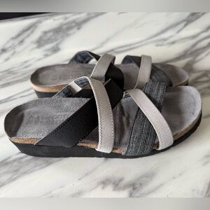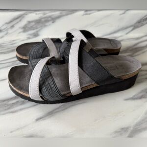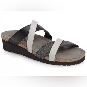 The Roxanna is a fashionable slide with contrasting colors. This sandal has padded technical lining creating comfort and absorbing moisture. The Roxanna features gore at the instep and front straps for adjustability. Naot's anatomic cork and latex footbed is wrapped in a pampering suede and molds to the shape of the foot with wear.