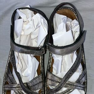 Naot size 41 sparkly bronze Sandals Velcro Ankle /toe Straps & Wedge sole