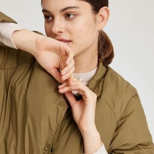 Ultra light down. A classic no-quilt down jacket – exquisitely smooth and luxuriously featherlight, warm and stylish. Offering a button-up open-front design, long sleeves, and seamless trim design. The ultimate winter wonder.