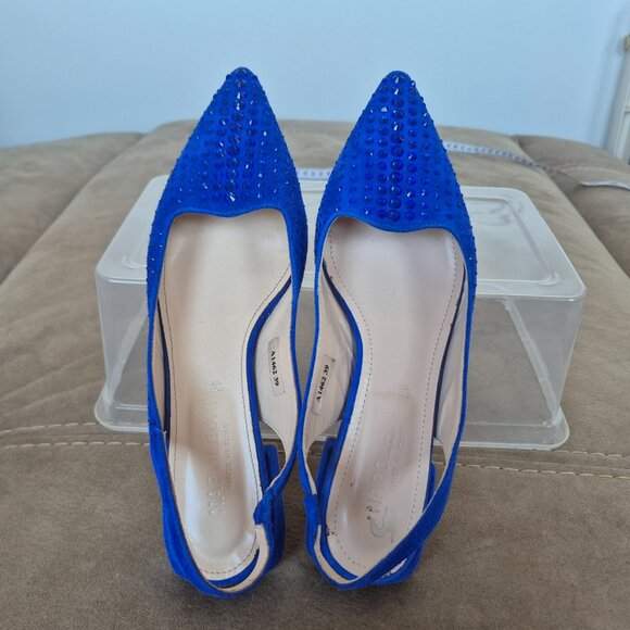 Sling back sandal in blue suede with swavorski elements/crystals. Worn once in great condition.