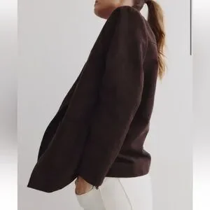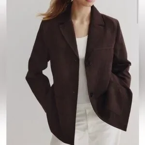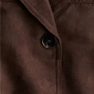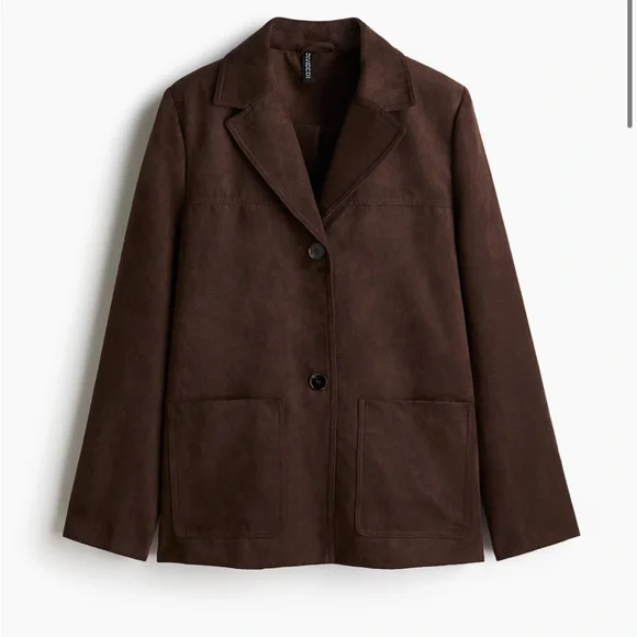 Jacket with notched lapels and buttons at front. Yoke at front and back, shoulder pads, and patch front pockets. Lined