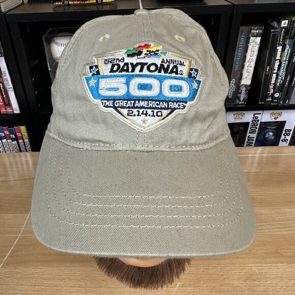 Khaki hat with Daytona 500 embroidery. Features colorful logo design. Adjustable strap for comfort.