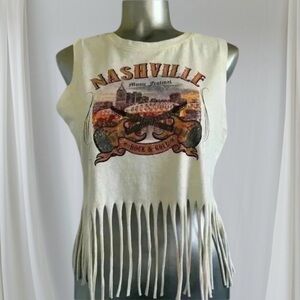 This Nashville tee crop top features a stylish cut out design and a unique fringe detail at the bottom, giving it a bohemian flair. The large graphic print showcases a vintage-inspired design with warm colors and musical elements, perfect for casual outings.