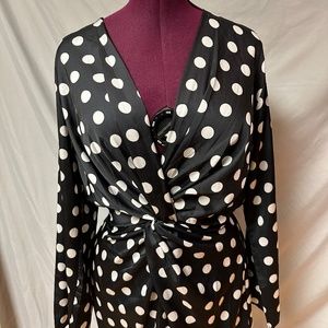 Chic polka dot midi dress with a wrap design. Features long sleeves and a flattering fit.