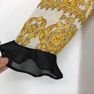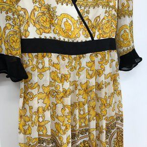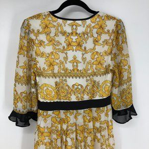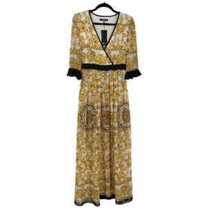 Elegant yellow maxi dress with black accents. Features floral pattern and tie waist. Perfect for any occasion.