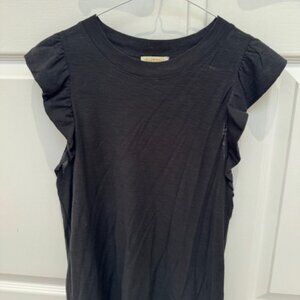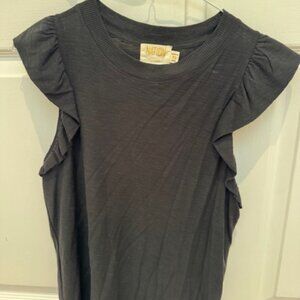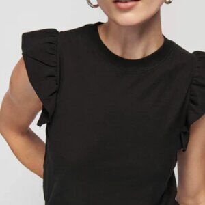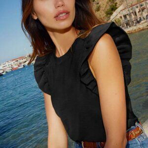 This is not your average jet black, ruffle tank: the ruffles are lightly fused, which adds a little extra kick. Close to the body for a more contoured silhouette. Size down for a more fitted look, size up for a little more ease.