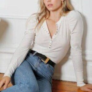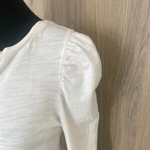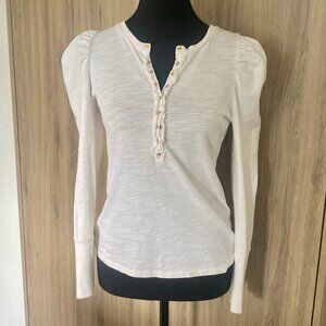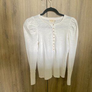 Like new condition NATION LTD Clementine delicate ruffle top in off-white. The button detail is incredible, puff/ruffle sleeve, long cuff, and can be worn tuxedo style - done up or v-neck style, unbuttoned. This beautiful top is a size XS and made from 100% cotton.