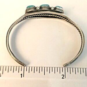Very nice child-size Navajo Sterling cuff with three turquoise stones. Sawtooth bezels and raindrops between stones. End to end is 4.5" with a 1" gap and a fair bit of flex.