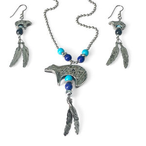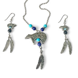 Native American Necklace & Earring Set Silver Bear Feathers Turquoise Blue Beads