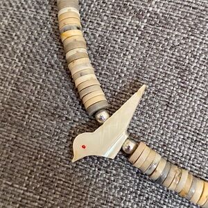 This necklace is a Southwest-style "fetish bird" choker, characterized by small, disc-like beads and hand-carved charms.