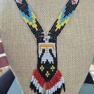 Native necklace , small defect with string pls see pictures . Price. reflects . Thos is a very unique native piece of work . Intricate beaded necklace with vibrant patterns. Features black, red, yellow, and blue beads. Unique design by Native.