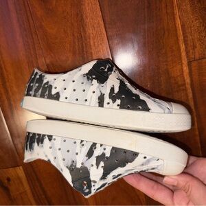 These Native water shoes feature a striking black and white speckled design, perfect for casual outings or water-based activities. The slip-on style offers convenience, while the flexible material ensures comfort and the durable rubber sole provides excellent traction.