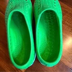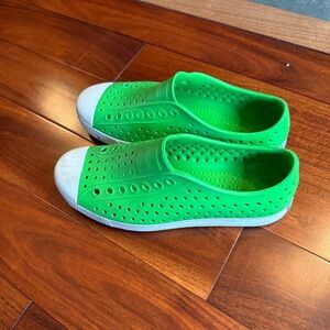 Dive into comfort with these Native water shoes, featuring a vibrant green body and contrasting white toe caps. Designed with a perforated pattern for optimal ventilation, these slip-on shoes are crafted from a lightweight, molded material perfect for water activities. Their low-cut design ensures easy wear and a stylish look.