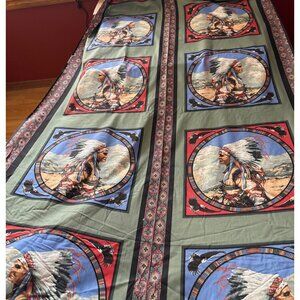 Celebrate the rich cultural heritage with this vibrant fabric panel, depicting a Native American chief adorned with an intricate headdress. Ideal for creative projects like quilting or wall decor. The vivid colors and detailed design make it a standout piece for enthusiasts of traditional artistry.
