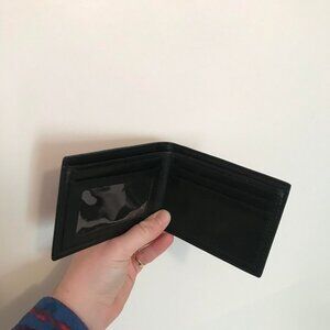 Brand new men's wallet accented with a native art style moose on both sides. The black leather makes all of the colours pop and the accent of the quality lining on the inside is truly classy. There are places for cards, money and ID. This comes as preowned; new never used and with the original box! Made in Canada.