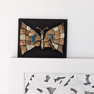 3D metal sculpture depicting two first nations looking at each other in full headdress, also a butterfly. Made from a mixture of different metals; copper, brass, not sure what the third is. Maybe aluminum. Turquoise resin contrasts beautifully with these warm metal tones. Affixed to a 1/2 thick wooden board that has been painted a warm mat black.