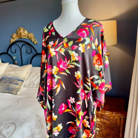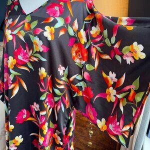 Natori satin caftan, black with a multicolour tropical flower print. Size M. V neck, kimono style sleeves. Good used condition. Bust measures 23.25 inches across laying flat, length from shoulder to hem is 51 inches. Cat friendly, nonsmoking home.