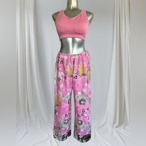 These wide leg pants by Natori feature a soft pink background adorned with playful floral style in white, black, and tan. The elastic waistband ensures a comfortable fit, while the contrasting black lace trim at the bottom adds a feminine touch to the relaxed design.