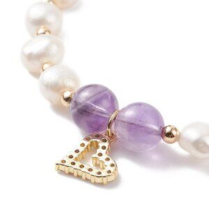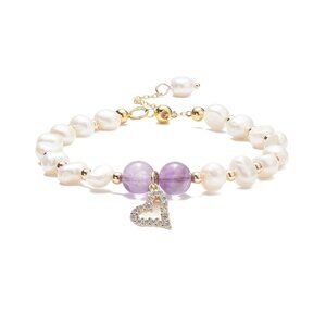 Natural Amethyst & Pearl Beaded Bracelet with Cubic Zirconia Heart Charm, Gemstone Jewelry for Women,