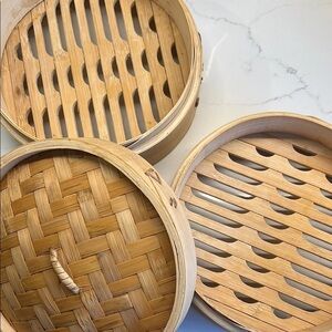 Set of round bamboo steamers with woven and slatted designs. Perfect for cooking.