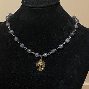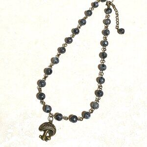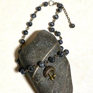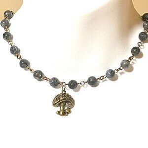 Natural Dark Larvikite Necklace, Bronze Round Mushroom+ Genuine Gemstone Choker