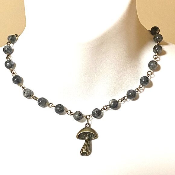 Natural Dark Larvikite Necklace, Bronze Slim Mushroom + Genuine Gemstone Choker