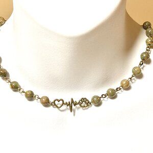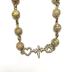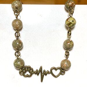 Natural Earthy Unakite Necklace, Bronze Paw Print Heart Beat + Genuine Gemstone