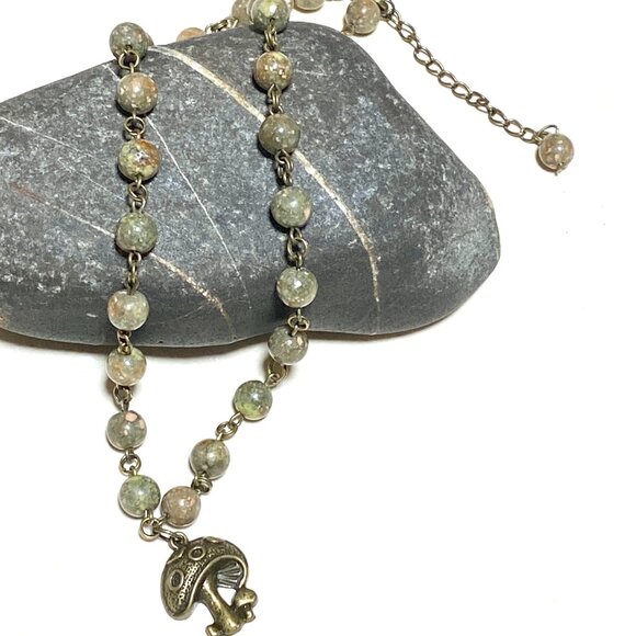 Natural Earthy Unakite Necklace, Cute Bronze Round Mushroom + Genuine Gemstone