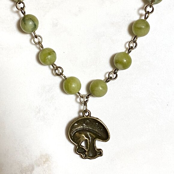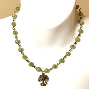 Natural Fern Green Serpentine Necklace, Bronze Round Mushroom+ Genuine Gemstone