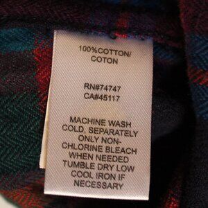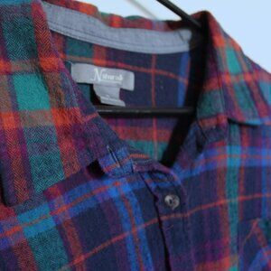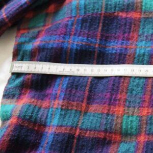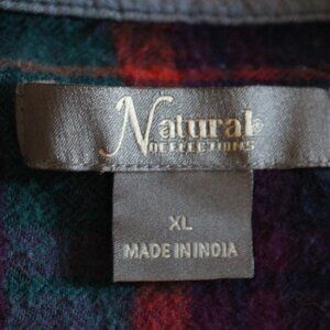 Never worn. Natural Reflections, brushed cotton, long-sleeved, soft plaid shirt, made from 100% Cotton. Made in India. Plaid is mostly blue, aqua, purple and orange, with thinner lines of red and green. Size XL. Photos with measuring tape have contrast turned up to make easier to read, but hues appear more intense. (Better cover shot arriving soon.)
