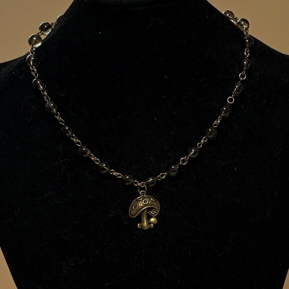 8 mm smoky quartz round beads; 23 mm (about 1") round mushroom bronze pendant