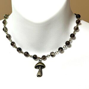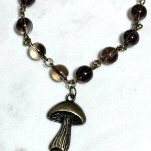 Natural Smoky Quartz Short Necklace, Genuine Gemstone + Bronze Slim Mushroom