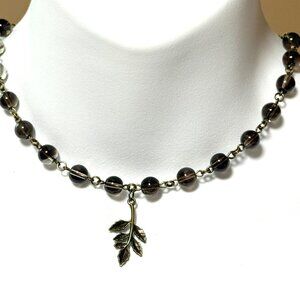 Natural Smoky Quartz Short Necklace, Genuine Gemstone + Cute Bronze Leaf Branch