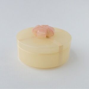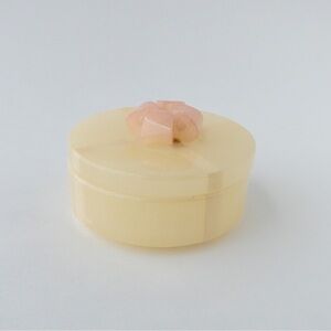 Dainty and cute natural stone jewelry box, trinket dish. Possibily alabaster. Designed as a gift with a pink bow on top. Pre-owned, with normal vintage wear such as light surface scratches. I did not notice any chips or cracks. Please refer to photos.