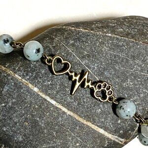 Natural Teal Kiwi Jasper Necklace, Bronze Paw Print Heart Beat + Genuine Gemstone