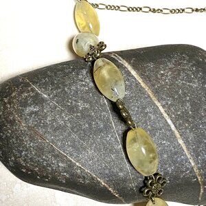 Natural Yellow Prehnite Necklace, Genuine Gemstones & Bronze Flower Chain