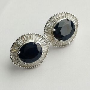 Oval Sapphire Earrings with Baguette Halo in Sterling Silver and Omega Back