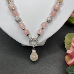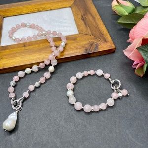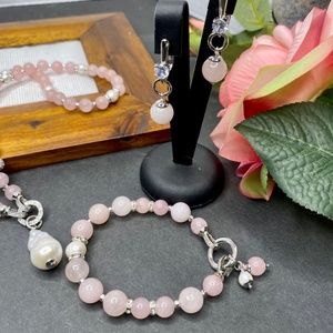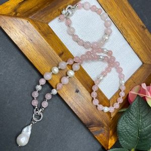 Natural gemstone jewellery set made of natural rose quartz beads 8 and 10 mm in diameter and 8 and 10 mm in diameter natural freshwater pearls. Removable pendant made of amazing 3 cm Baroque pearl. Premium quality hypoallergenic findings with CZ. The necklace length is 53 cm, the bracelet size is for 17 cm wrist and beautiful simple earrings with ear hooks with CZ. Can be sold as a set or a separately.