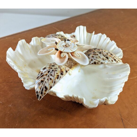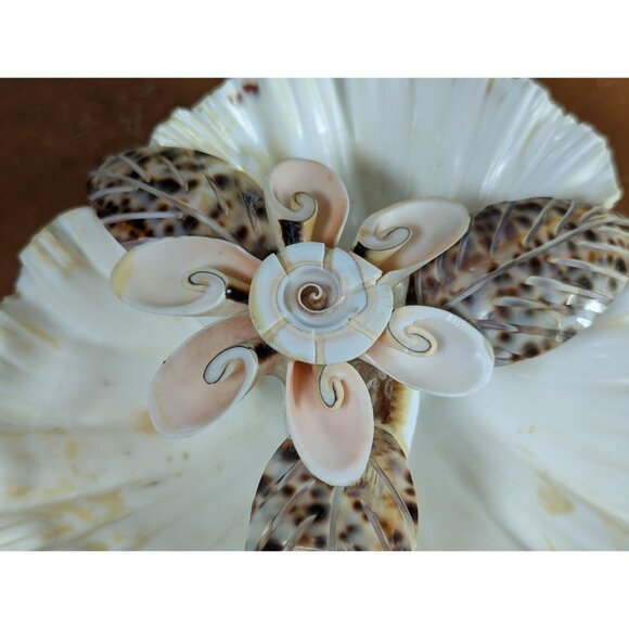 A natural shell dish, make from 3 larger shells to forms to base, 3 cut and carved shall segments to cover the seams and 7 cut shell parts to make up the central "flower". Likely originally a tropical tourist souvenir, it would make a great trinket or jewelry dish, or make a good key dish on the hallway table.