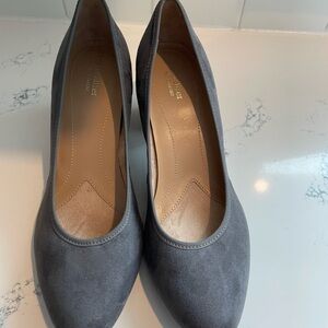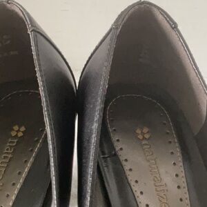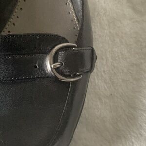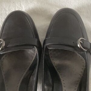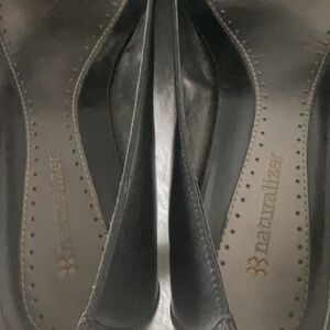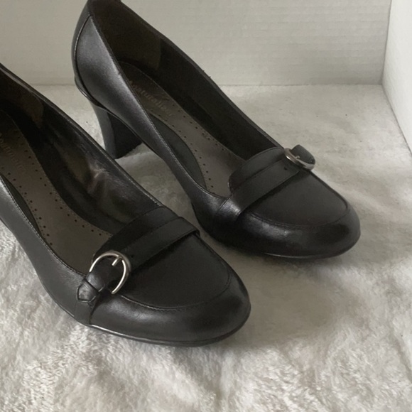 These elegant black heels by Naturalizer offer a sophisticated slip-on design with a comfortable medium heel height. Crafted from smooth leather-like material, they feature a stylish silver buckle on the front strap, making them ideal for professional or formal settings.